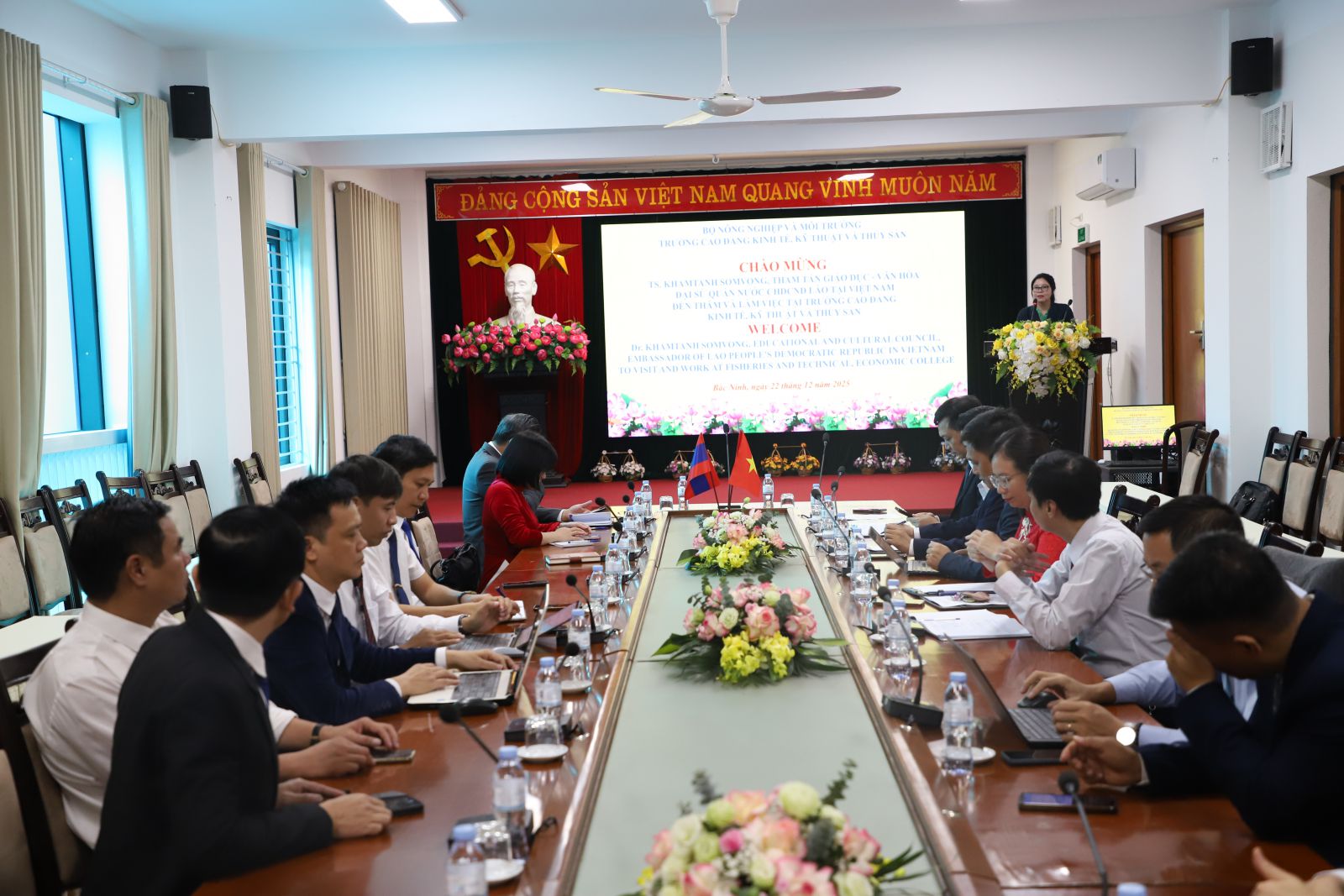Nhằm mục đích trao đổi, thống nhất kế hoạch hành động và thỏa thuận hợp tác công tác đào tạo lưu học sinh nước Cộng hòa dân chủ nhân dân Lào tại nhà Trường, ngày 22/12/2025 vừa qua, Trường Cao đẳng Kinh tế, Kỹ thuật và Thủy sản đã có buổi làm việc với Tiến sĩ Khamtanh SOMVONG – Tham tán Giáo dục – Văn hóa, Đại sứ quán nước CHDCND Lào tại Việt Nam để thống nhất một số nội dung liên quan đến công tác đào tạo lưu học sinh Lào tại nhà Trường.