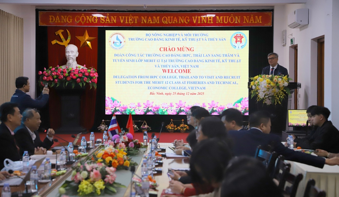 Sáng ngày 25/12/2025 vừa qua Ban giám hiệu cùng toàn thể CBGV Trường Cao đẳng Kinh tế, Kỹ thuật và Thủy sản đã tổ chức lễ đón tiếp đoàn Trường Cao đẳng Công nghệ IRPC (IRPC Technical College) đến thăm và làm việc tại nhà trường. Buổi làm việc nhằm mục đích: thảo luận, nâng cao hiệu quả hợp tác quốc tế, nâng cao chất lượng đào tạo và tạo điều kiện cho sinh viên nhà trường có cơ hội nhận học bổng và đi du học tại Thái Lan.