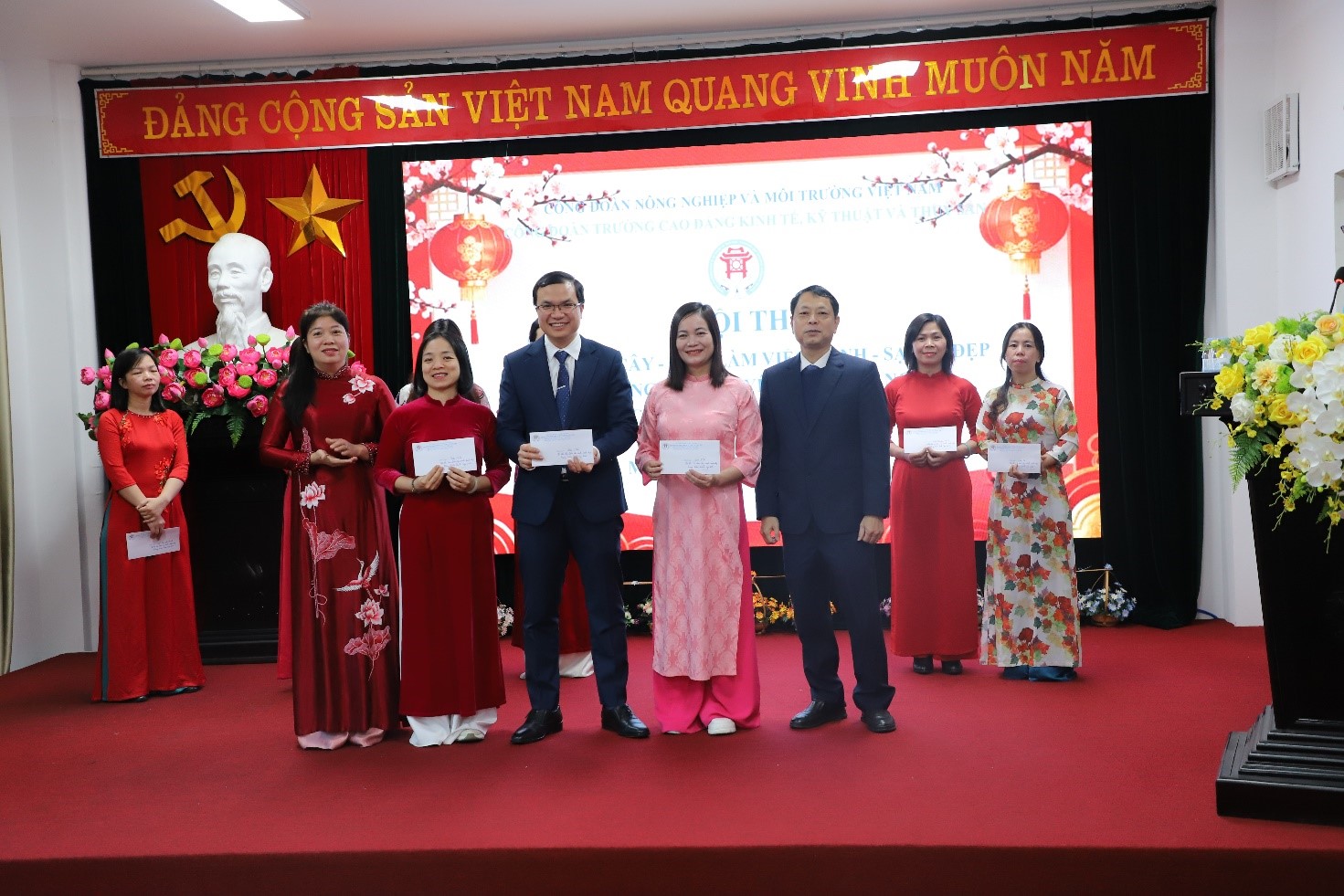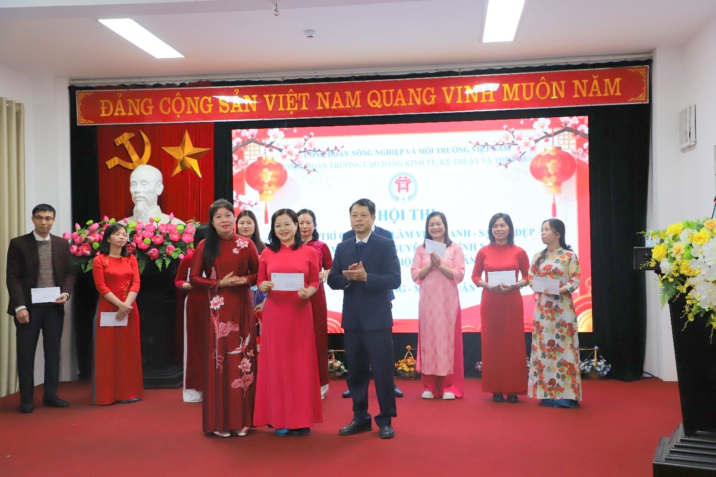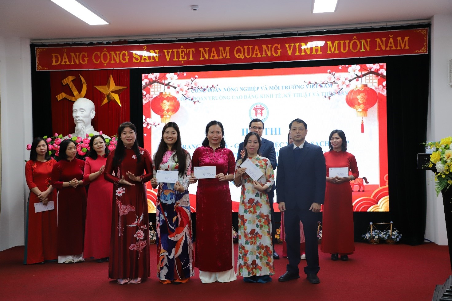 PGS-TS Thái Thanh Bình – Phó hiệu trưởng nhà trường, Ths Đặng Thị Khang – Chủ tịch Công đoàn trường trao thưởng cho công đoàn Khoa Kinh tế đạt giải Nhất Hội thi “Xanh, Sạch, Đẹp”.