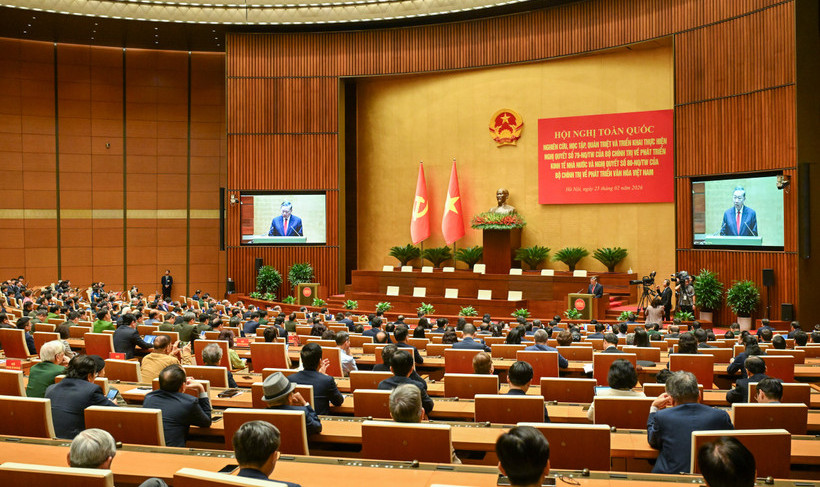 Sáng 25/02/2026, Bộ Chính trị, Ban Bí thư Trung ương Đảng tổ chức Hội nghị trực tiếp kết hợp trực tuyến toàn quốc quán triệt, triển khai thực hiện Nghị quyết số Nghị quyết số 79-NQ/TW của Bộ Chính trị về phát triển kinh tế Nhà nước; Nghị quyết số 80-NQ/TW của Bộ Chính trị về phát triển văn hóa Việt Nam. Hội nghị được kết nối từ điểm cầu Hội trường Diên Hồng (Tòa nhà Quốc hội) đến 27.284 điểm cầu trên cả nước.